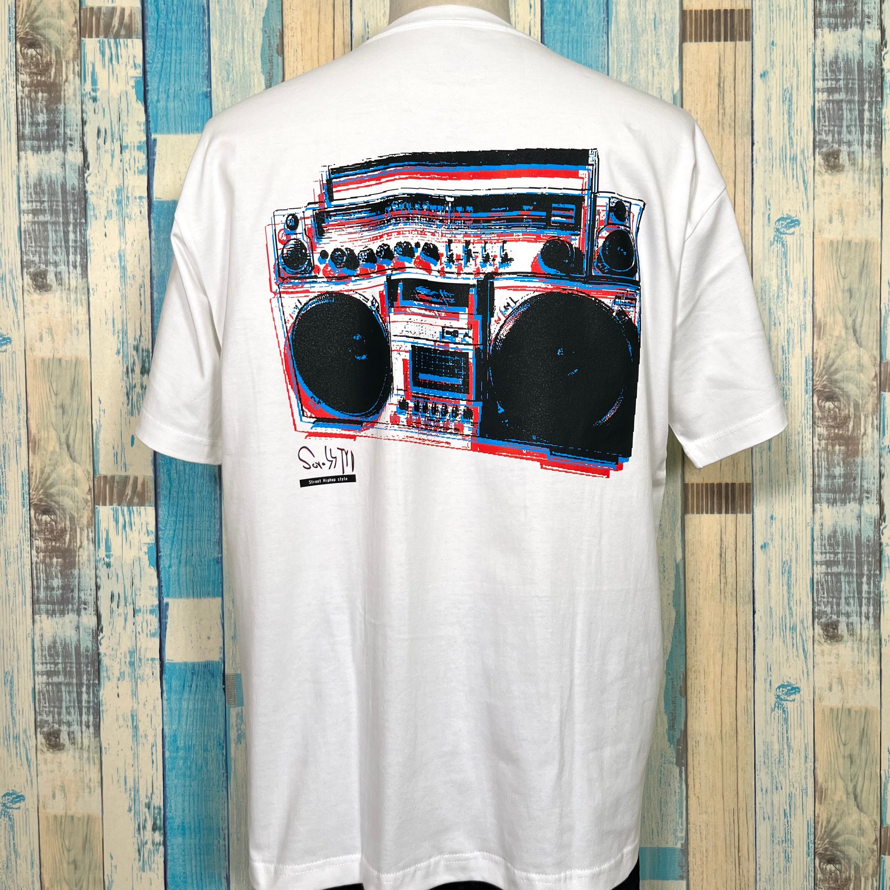 存在感のある背中のラジカセプリントは、80〜90年代のヒップホップカルチャーを彷彿とさせるヴィンテージデザインです。