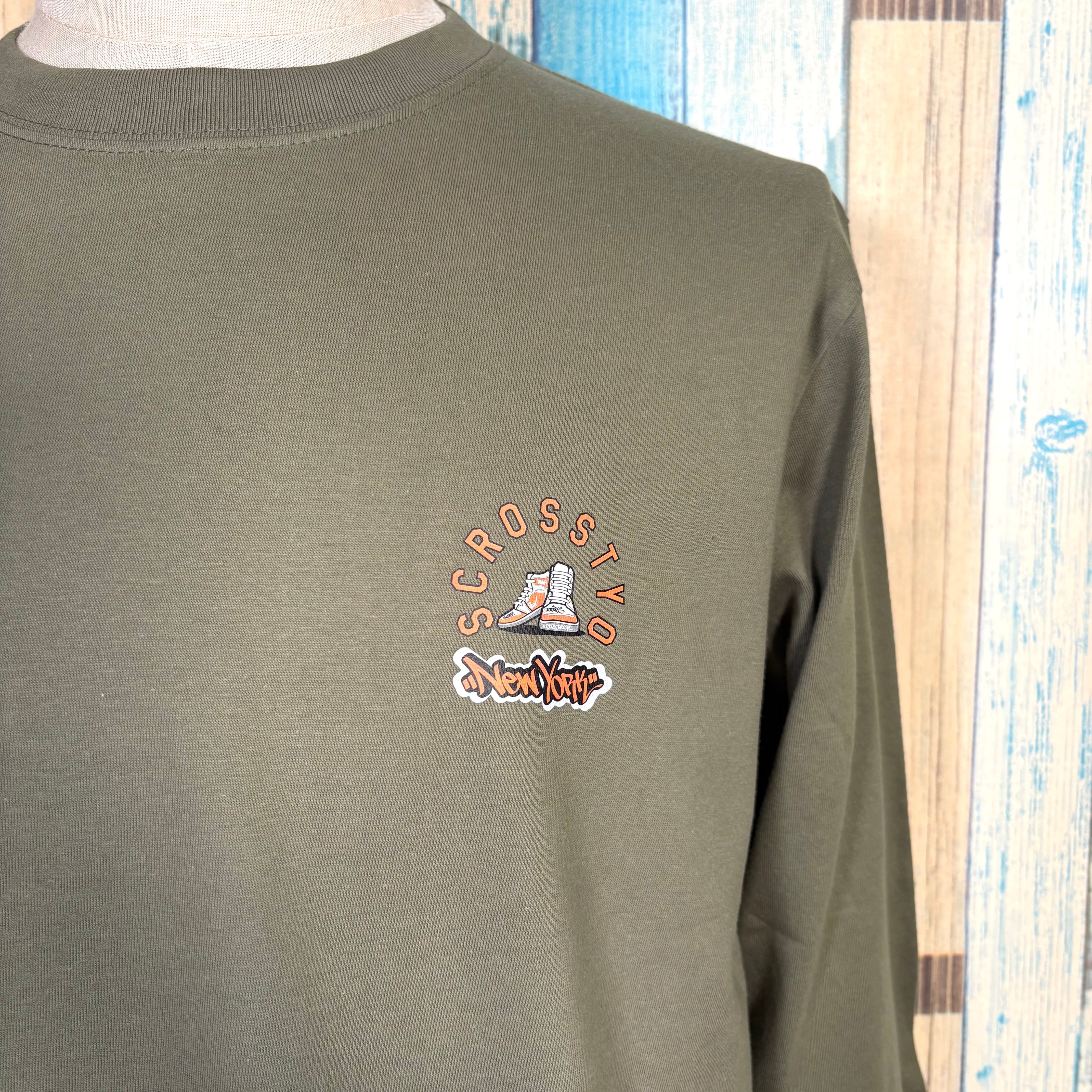 SCROSS TYOならではの、エッジの効いたストリート感あるバックプリントが目を引きつつ、胸元のシンプルなロゴが全体のバランスを絶妙に整えます。